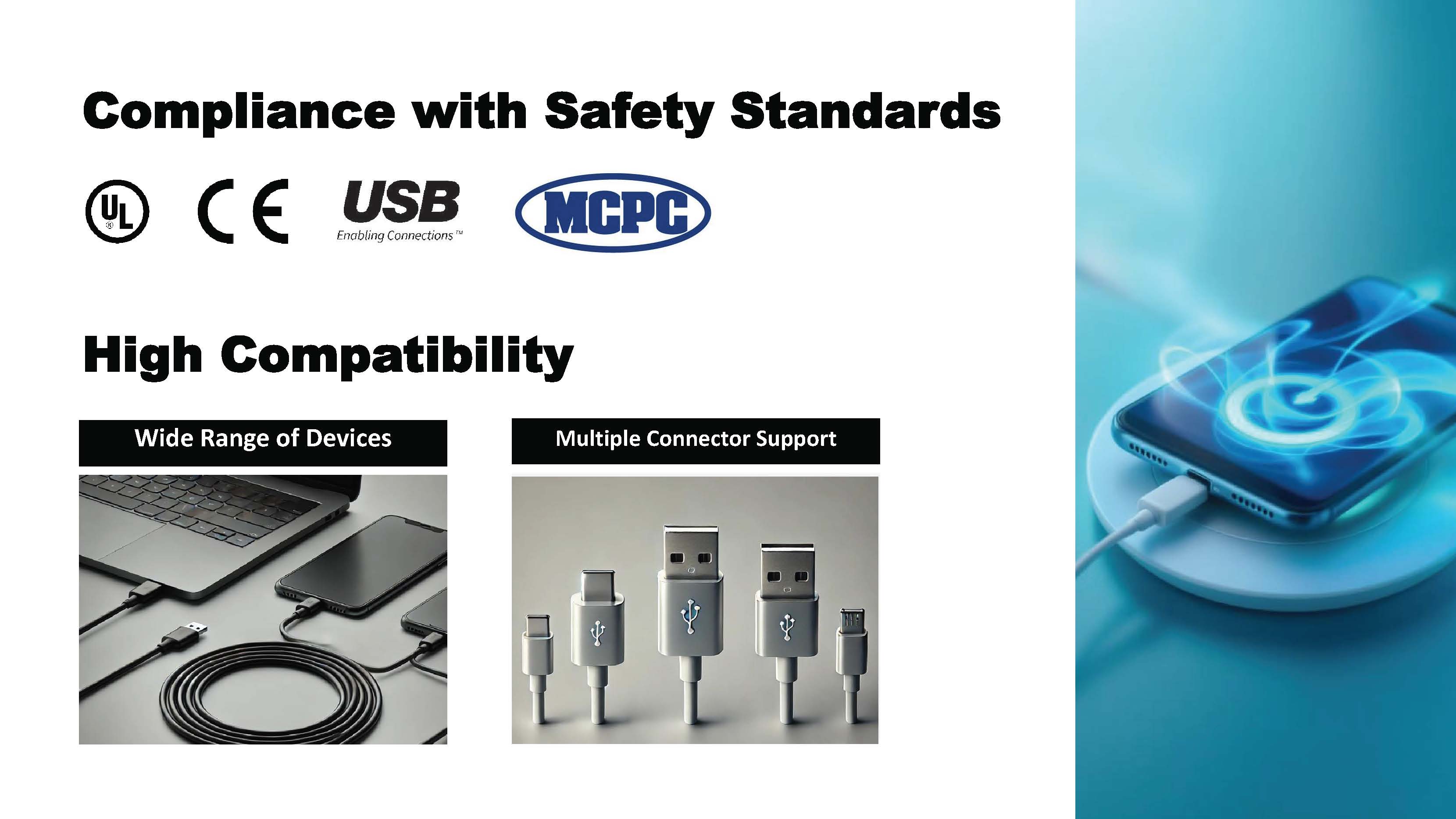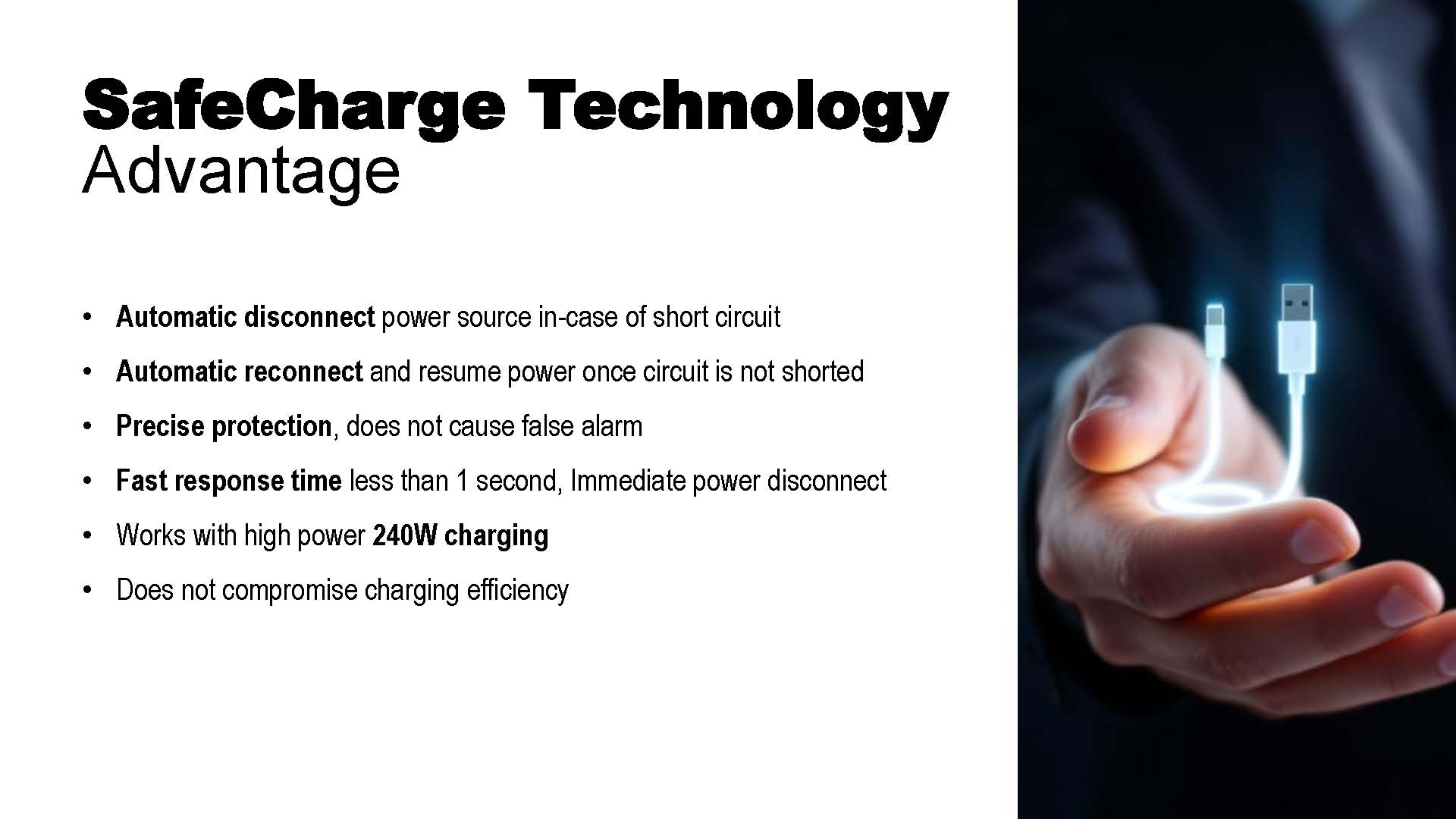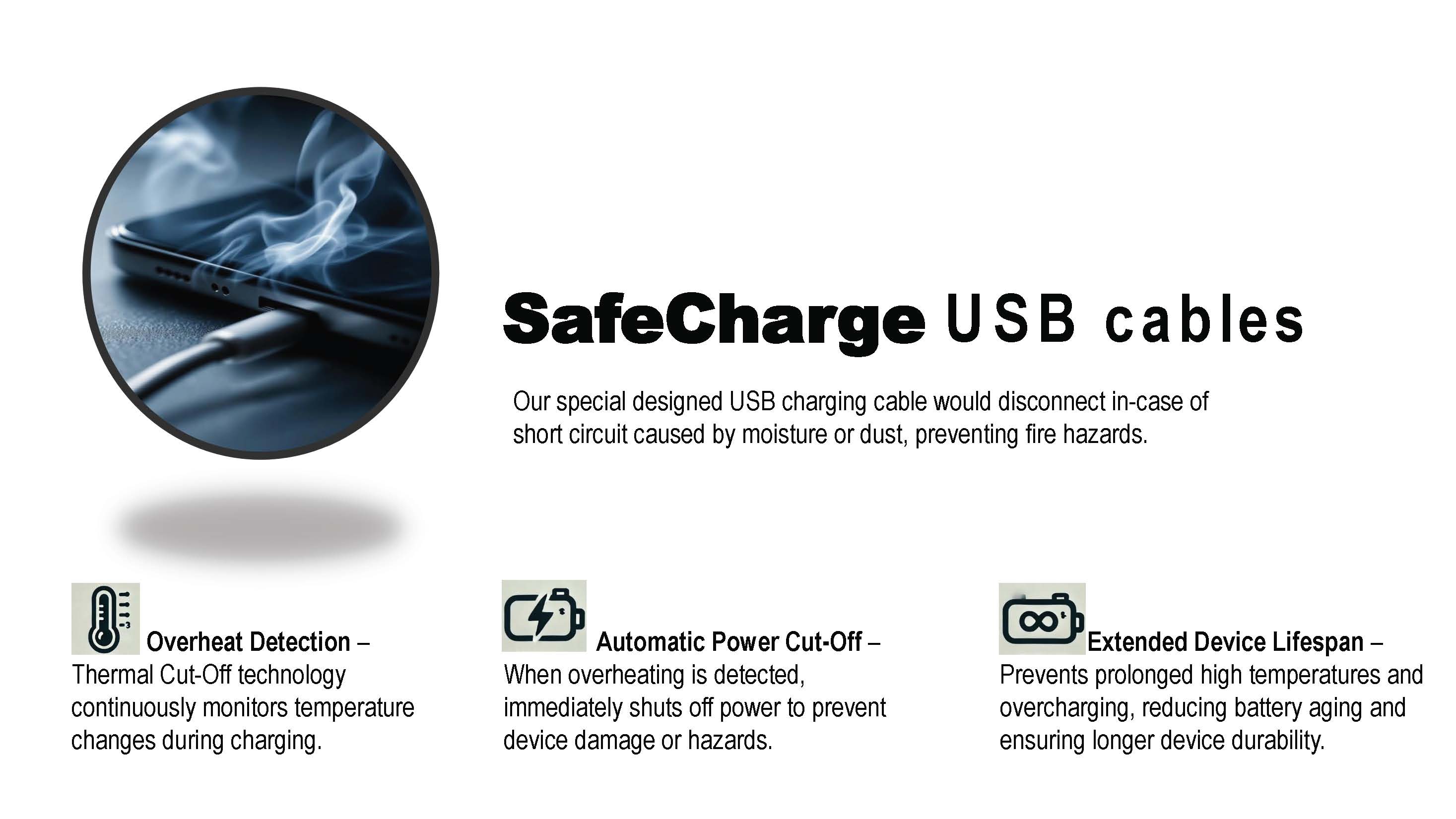 Our special designed USB charging cable would disconnect in-case of short circuit caused by moisture or dust, preventing fire hazards.